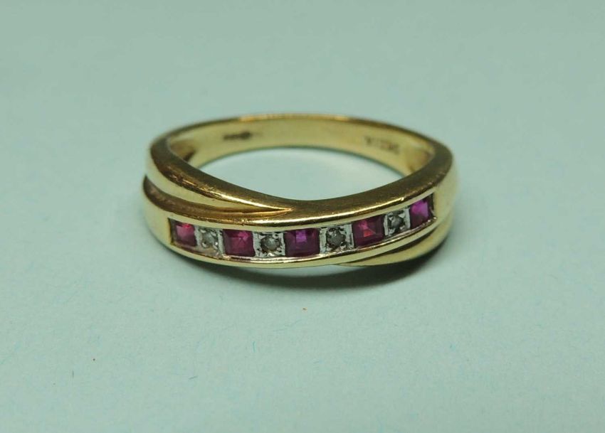 RUBY & DIAMOND CROSSOVER HALF-ETERNITY RING in 9ct gold, size P, 3.33gProvenance: private collection Wirral