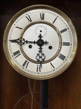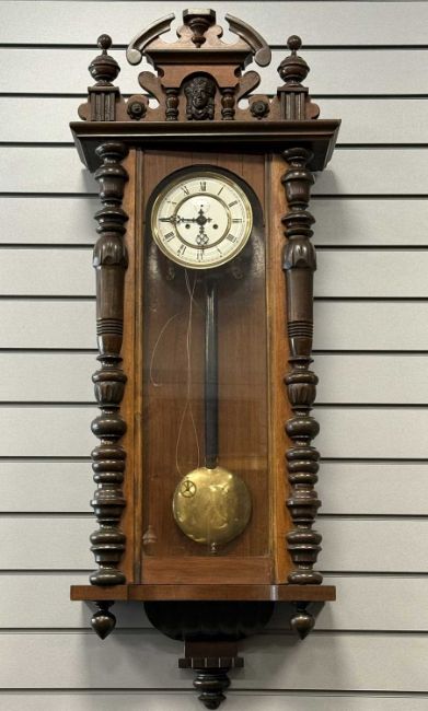 VIENNA WALNUT CASED CHIMING WALL CLOCK, with pendulum and two weights, 117 (h) x 47cms (w)Provenance: private collection Cheshire