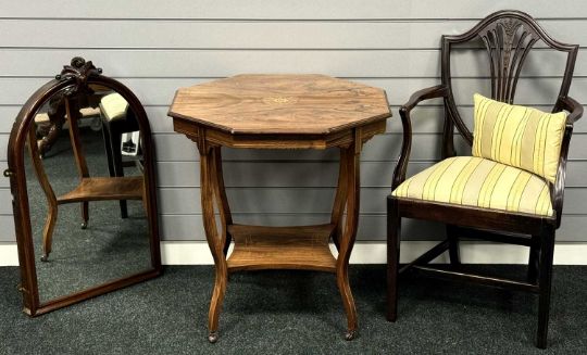 FURNITURE PARCEL, comprising Victorian octagonal inlaid rosewood two-tier centre table, 72 (h) x 69 (w) x 69cms (d); mahogany elbow chair, splat back carved with wheat sheaves, upholstered drop-in seat, 94 (h) x 55 (w) x 37cms (d); and mahogany framed arched wall mirror with carved pediment, 82 (h) x 51 (w) x 6cms (d)Provenance: deceased estate Wrexham