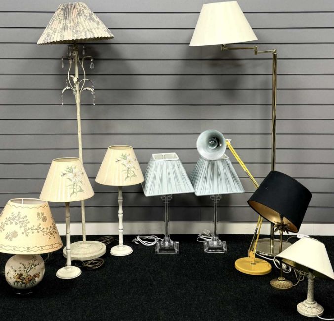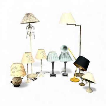 VARIOUS TABLE LAMPS, including a pair with perspex columns and silk effect shades, pair of bamboo effect with decorative card shades, etc.Provenance: deceased estate Wrexham