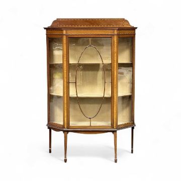 EDWARDIAN INLAID MAHOGANY DISPLAY CABINET with raised back, single glazed door with oval beaded panel, canted sides with plain glazing, two fixed shelves to interior, on tapered square supports, 'Jones & Higgins, Peckham' label verso, 157 (h) x 104 (w) x 36cms (d)Provenance: private collection Cheshire