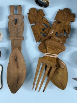 ASSORTED COLLECTABLES GROUP, including two Bilston oval enamel patch boxes, 'A token of regard' and 'Keep this for my sake'; two Halcyon Days enamel boxes, 'Happy Anniversary' and '1989'; magnifying glass with composite dog handle; folk art carved wood knife and fork; Solingen novelty letter opener with leather sheath, etc.Provenance: deceased estate Wrexham