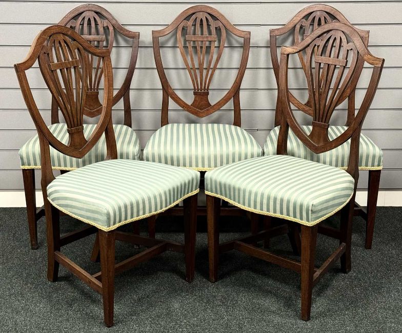 FURNITURE PARCEL, comprising French carved oak double bed, Seventh Heaven, 148cms (w); Queen Anne style oak bureau, c. 1920, 107 (h) x 79cms (w); and set of six mahogany shield back dining chairs, late 19th century, comprising five singles and one carverProvenance: private collection Conwy