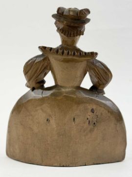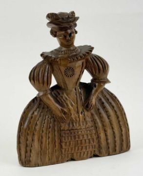 FOLK ART CARVED WOOD FIGURE of a lady in Elizabethan type dress, late 19th century, similar in style to Sergiev Posad, 17cms (h); and ANTIQUE BEAM SCALES, wooden shaft with brass and hand-forged iron furniture, 66cms (l)Provenance: private collection Wrexham