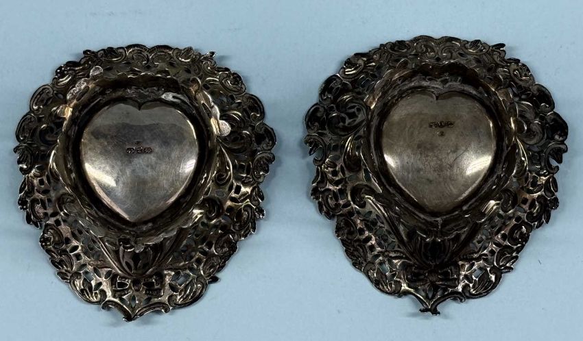 PAIR OF VICTORIAN SILVER HEART SHAPED BON BON DISHES, pierced and chased decoration, Levi & Salaman, Birmingham 1891, 3 (h) x 9 (w) x 8cms (d), 2.5oztProvenance: private collection Shropshire