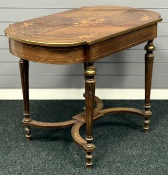 FRENCH NAPOLEON III REVIVAL KINGWOOD DESK, floral inlaid shaped top with brass rim, over a frieze drawer, fluted tapered turned supports united by stretchers with inverted brass finial to centre, 76 (h) x 101 (w) x 60cms (d)Provenance: private collection Cheshire