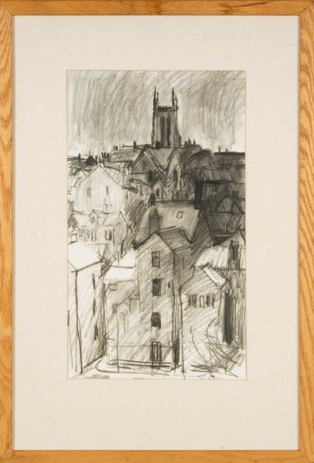 ‡ JACK SHORE (Welsh, 1922-2008) charcoal on paper - buildings with a large cathedral at the centre, signed, 48 x 28cmsProvenance: private collection South YorkshireComments: framed, glazed