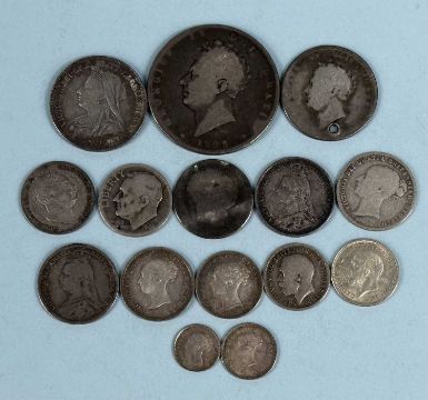 ANTIQUE SILVER COINS, 1825 half crown, 1897 shilling, 1887 shilling, various thrupenny bits, etc., 46gProvenance: private collection Pembrokeshire