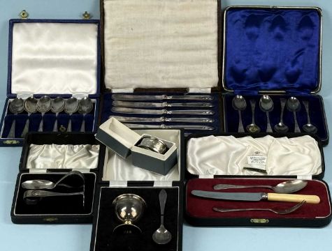 ASSORTED CASED SILVERWARE, including egg cup and spoon, child's pusher and spoon, two sets of six teaspoons, six silver-handled dessert knives, and napkin ringProvenance: private collection Shropshire