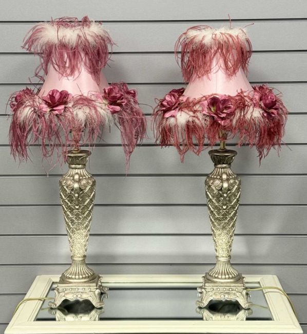 ELABORATE PAIR OF TABLE LAMPS, gilded composite stands, pink satin shades embellished with feathers and flowers, 81cms (h)Provenance: private collection Merseyside