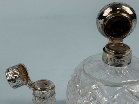 TWO CUT-GLASS SCENT BOTTLES, globular with hinged silver cover, 14cms (h); and cylindrical with hinged silver cover, 9.5cms (h)Provenance: private collection Merseyside