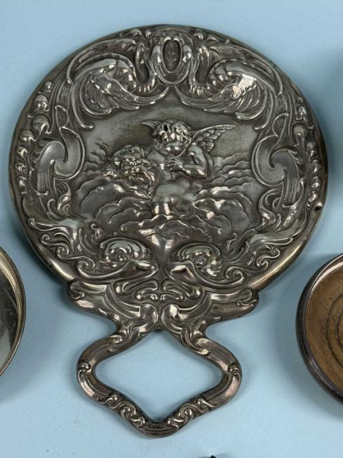ASSORTED SILVER COLLECTABLES, including silver-backed hand mirror embossed with cherubs and scrolls, pair of circular wine coasters with wooden bases, pair of silver pin trays on bun feet, etc.Provenance: private collection Ynys Môn