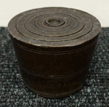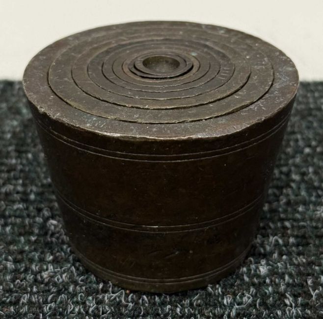 ANTIQUE METALWARE, two circular brass jam pans, largest 16 (h) x 31.5cms (diam.); graduated set of four brass saucepans with hollow steel handles; and set of nine antique bronze nesting weights, largest 6 (h) x 8cms (diam.)Provenance: private collection Cheshire