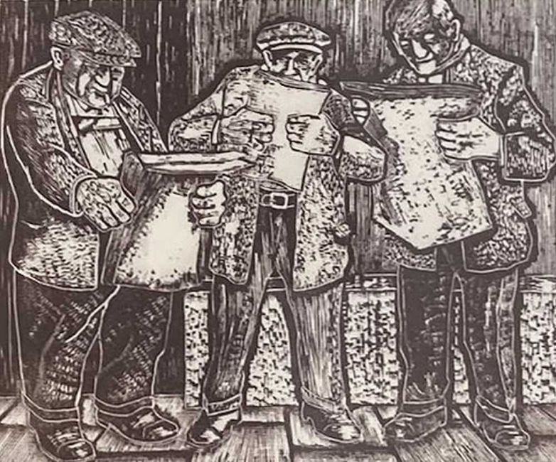 KAREL LEK (1929-2020) artist's proof - untitled, three men standing reading papers, signed, 22 x 27cms