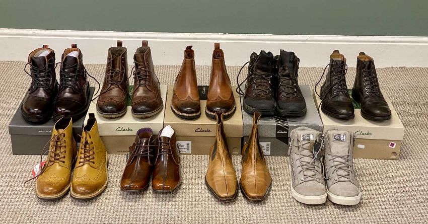 NINETEEN PAIRS OF ASSORTED BOOT STYLES, sizes 9-11, Clarks, Firetrap, Caterpillar, Pavers, Samuel Windsor, etc., new and nearly newProvenance: private collection Conwy