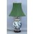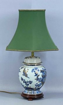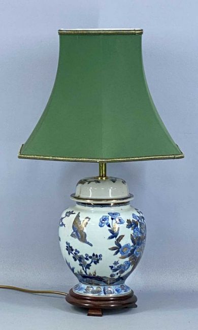 THREE CONTEMPORARY TABLE LAMPS, brass effect with adjustable column and pleated fabric shade, 59cms (h); Chinese ceramic with green and cream glazed floral decoration, 36cms (h) excluding fitting; and Chinese style lidded baluster vase, decorated with birds, green fabric shade, 62cms (h) overall Provenance: private collection Conwy