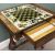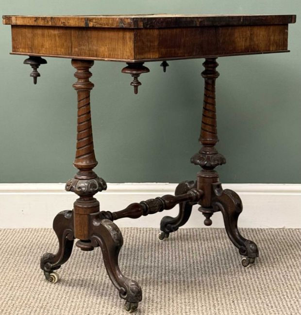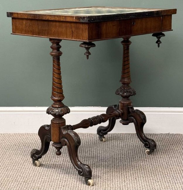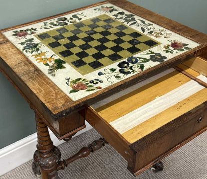 VICTORIAN ROSEWOOD GAMES TABLE, rectangular top having inset glass chess board with painted detail, over frieze drawer, turned and carved end supports united by turned stretchers, 76 (h) x 64 (w) x 54cms (d)Provenance: private collection Conwy