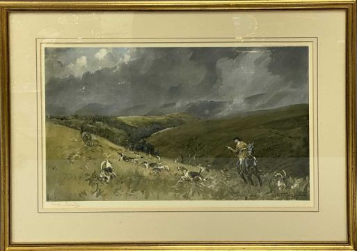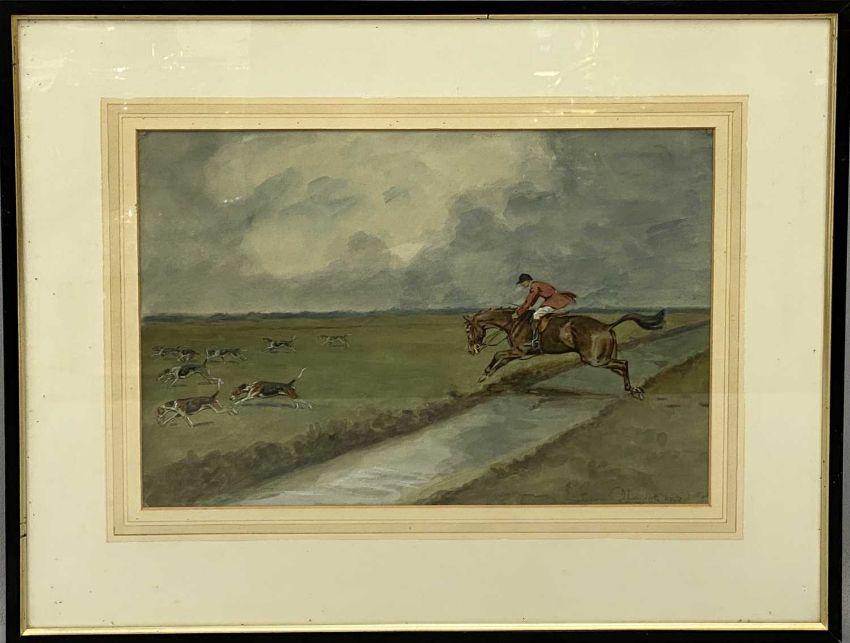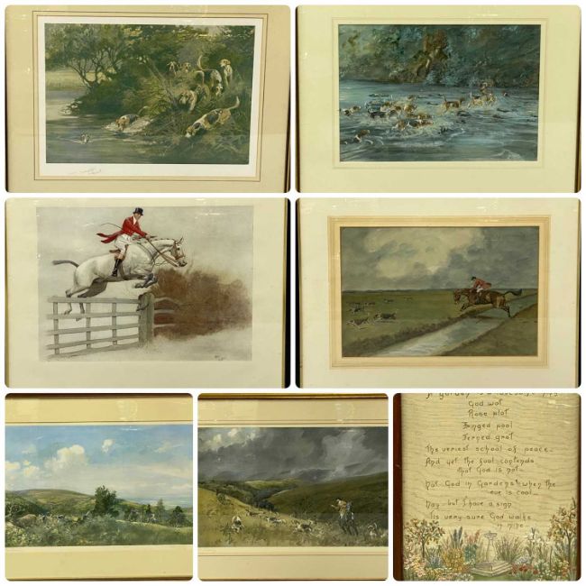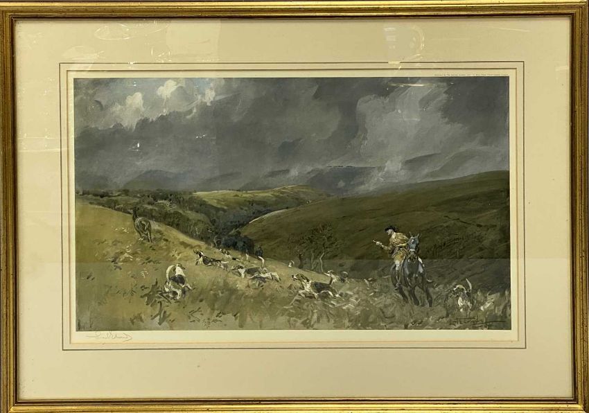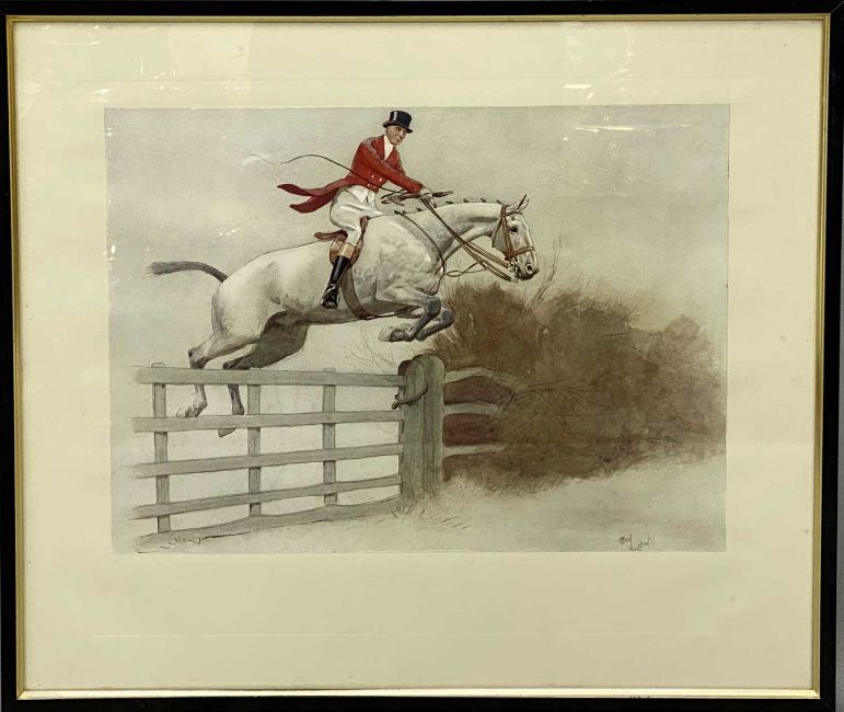 HUNTING INTEREST: GROUP OF PICTURES, including UNKNOWN watercolour - pack of hounds crossing a river, indistinctly signed lower right, 21.5 x 30cms; UNKNOWN watercolour - huntsmen and hounds jumping a river, indistinctly signed and dated 1948 lower right, 25.5 x 37cms; CECIL ALDIN (1870-1935) colour print - huntsman on grey horse jumping a five bar gate, 41 x 47cms; LIONEL EDWARDS (1878-1966) pair of colour prints - deer hunting, signed in pencil, 32 x 50cms; THOMAS IVESTER-LLOYD (1873-1942) print - hounds by river, signed in pencil lower left, 30 x 40.5cmsProvenance: private collection ConwyComments: all framed and glazed