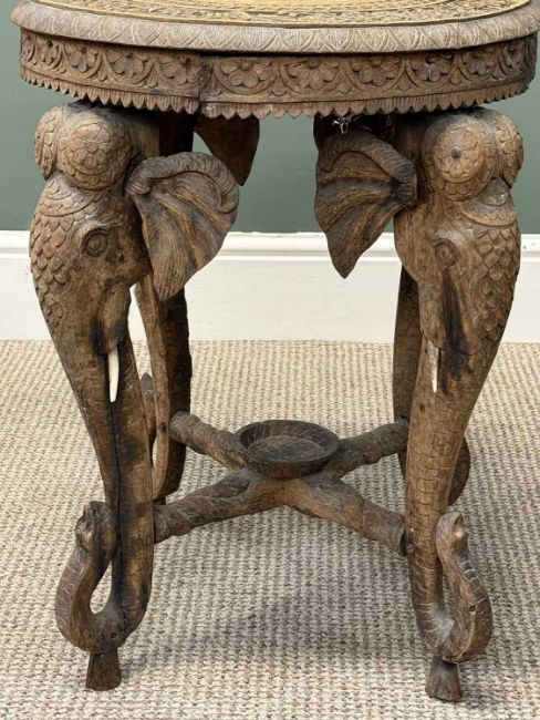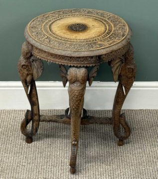 EASTERN CARVED CIRCULAR OCCASIONAL TABLE, elephant head supports with bone tusks, 58 (h) x 46cms (diam.)Provenance: private collection Conwy