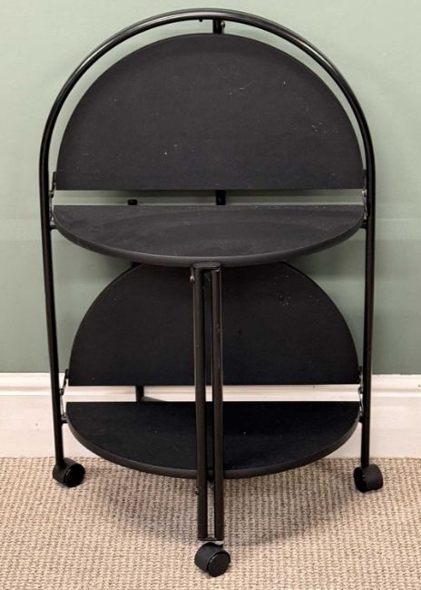 RETRO FURNITURE ASSORTMENT, comprising circular two-tier trolley, 62 (h) x 74cms (diam.); folding black two-tier trolley, 83 (h) x 54cms (diam.); and vintage brass lamp and shade with tripod baseProvenance: deceased estate Conwy
