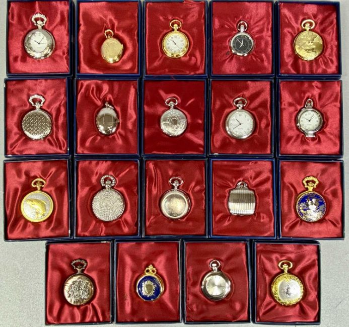 COLLECTION OF NINETEEN REPRODUCTION POCKET WATCHES, cases in various materials, all manual wind, all boxedProvenance: private collection Conwy