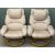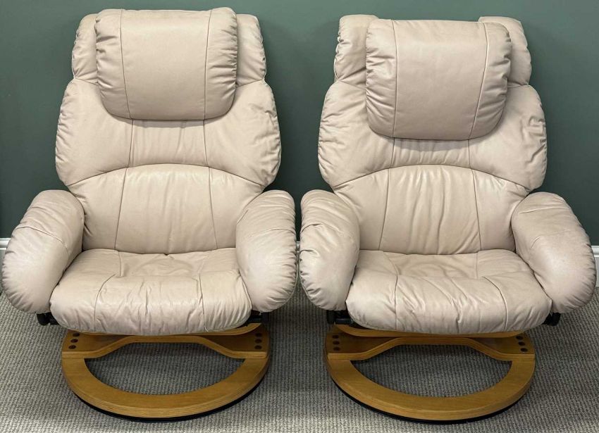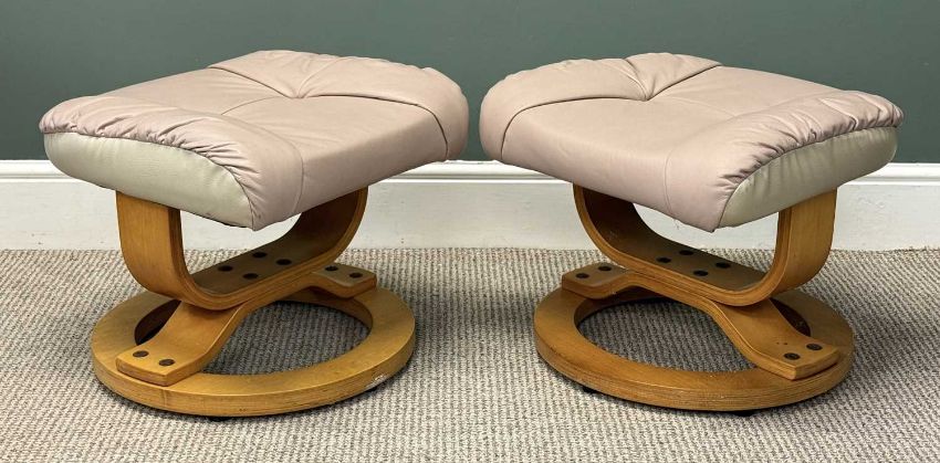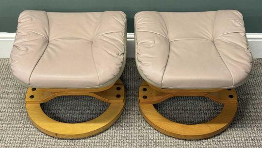 PAIR OF TWO-TONE VINYL UPHOLSTERED EASY CHAIRS, swivel and recline, 100 (h) x 80 (w) x 63cms (d); and matching footstools, 42 (h) x 48 (w) x 47cms (d)Provenance: deceased estate Conwy
