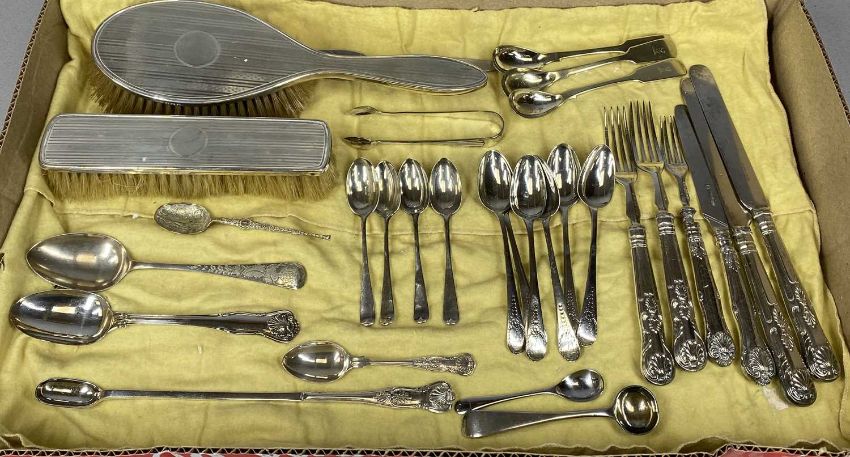 ASSORTED CUTLERY, including various silver teaspoons, 2.5ozt gross, silver-handled cutlery, two silver-backed hairbrushes, etc.Provenance: private collection Ynys Môn
