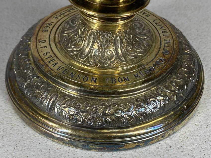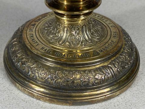 VICTORIAN SILVER GILT WINE EWER in the Cellini style, all-over repoussé decoration with figures and scrolls, caryatid scroll handle, base inscribed 'J.F. Steavenson from members of the Trinity Hall Boat Club Cambridge 1866', Elkington & Co., Birmingham 1864, 31cms (h), 19oztProvenance: private collection Ynys Môn