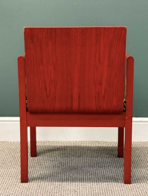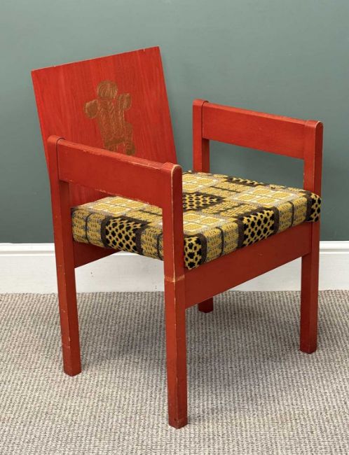 1969 PRINCE OF WALES INVESTITURE CHAIR, designed by Lord Snowdon and manufactured by Remploy, in red stained beech and plywood with olive ash, embossed with Prince of Wales feathers motif in gold leaf, the seat later covered in Welsh blanket material, 78 (h) x 54 (w) x 49cms (d)Provenance: private collection Gwynedd