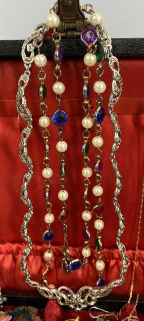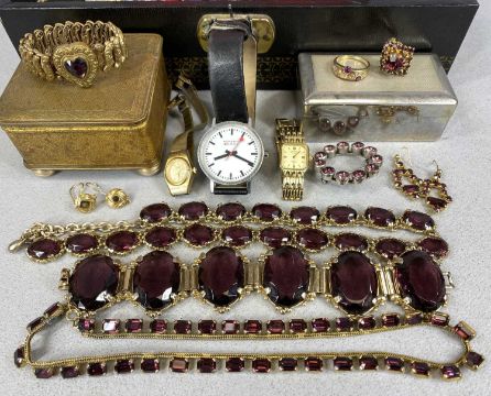 ASSORTMENT OF COSTUME JEWELLERY & WRISTWATCHES, contained in trinket box, together with gilt metal trinket box and chrome plated trinket boxProvenance: private collection Conwy