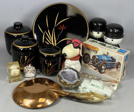ASSORTED COLLECTABLES, including Japanese black lacquered kitchen storage set with hand-painted decoration, Matchbox 1:32 scale kit Bugatti Type 59, etc.Provenance: deceased estate Conwy