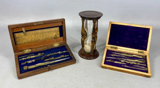 TWO MAHOGANY CASED TECHNICAL DRAWING SETS, and a vintage mahogany and glass egg timerProvenance: private collection Denbighshire