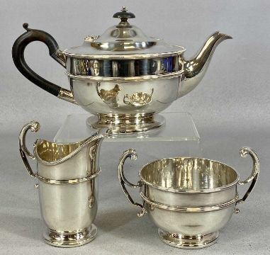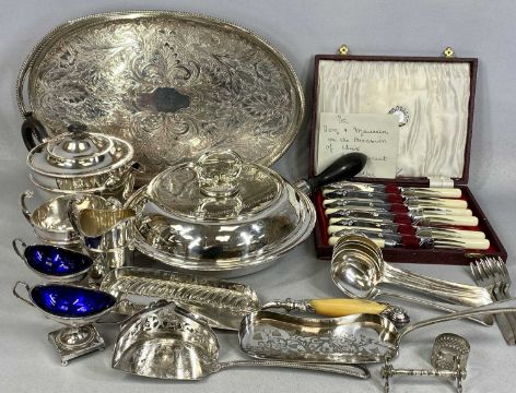ASSORTED PLATED WARE, including oval tea tray with pierced gallery and scroll engraved field, three-piece tea service, pair of oval two-handled boat shaped open salts with blue glass liners, circular lidded pan with turned ebony side handles, etc.Provenance: private collection Ynys Môn
