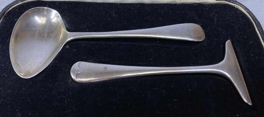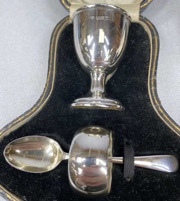 CASED SILVER CHRISTENING SET, comprising egg cup, spoon and serviette ring, Sheffield 1927/28, and cased silver child's pusher and spoon, Sheffield 1938Provenance: private collection Ynys Môn