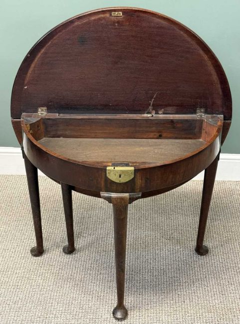 19TH CENTURY MAHOGANY DEMILUNE TEA TABLE, fold-over top with polished interior, cabriole supports, 68 (h) x 82cms (diam.)Provenance: private collection Conwy