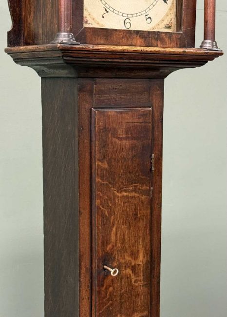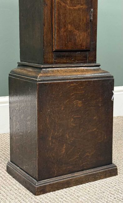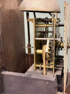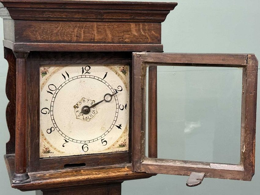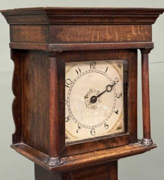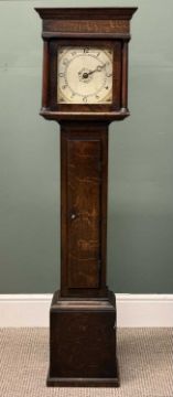 OAK GRANDMOTHER CLOCK, painted enamel dial with Arabic numerals, 30-hour movement striking on a bell, 143 (h) x 36 (w) x 24cms (d)Provenance: private collection Conwy