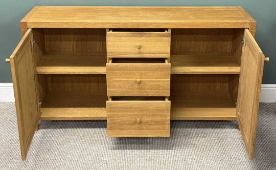 MODERN LIGHT OAK SIDEBOARD, three central drawers, cupboard to either side baring Laura Ashley label, 80 (h) x 151 (w) x 41cms (d)Provenance: private collection Conwy