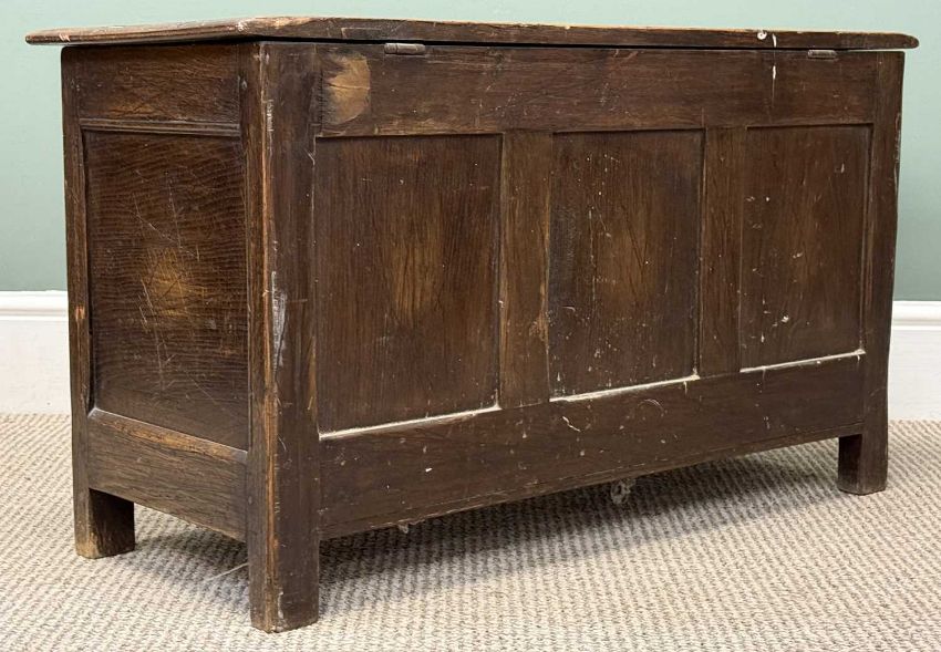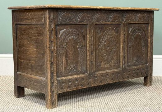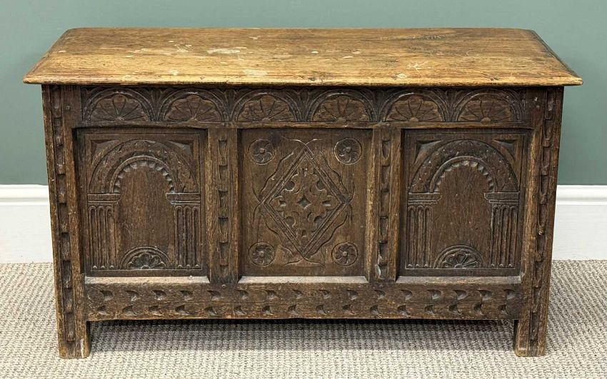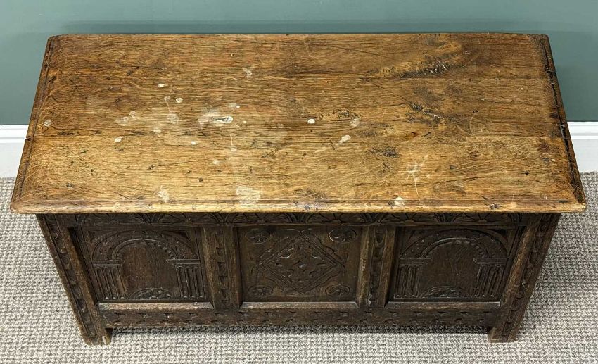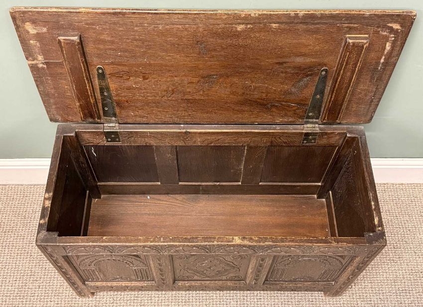 CARVED OAK BLANKET BOX with triple panel front, 50 (h) x 87 (w) x 37cms (d)Provenance: private collection Conwy