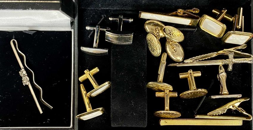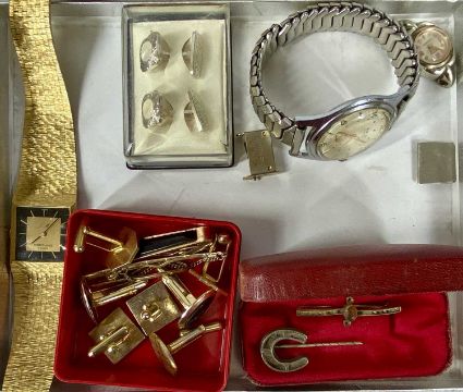 ASSORTED JEWELLERY, WATCHES & COLLECTABLES, including various gilt metal cufflinks and tie bars, Smiths Emperor gold-plated wristwatch, vintage Solo chrome-plated wristwatch, and other itemsProvenance: private collection Gwynedd