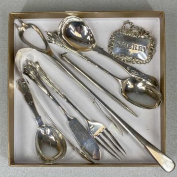 SILVER CUTLERY / COLLECTABLES, including Victorian caddy spoon, Henry Holland, London 1871; George V pickle spoon, Sheffield 1925; George III wine label 'Sherry', Edward, Edward Jr., John & William Barnard, London 1833, etc., 3.5oztProvenance: private collection Ynys Môn