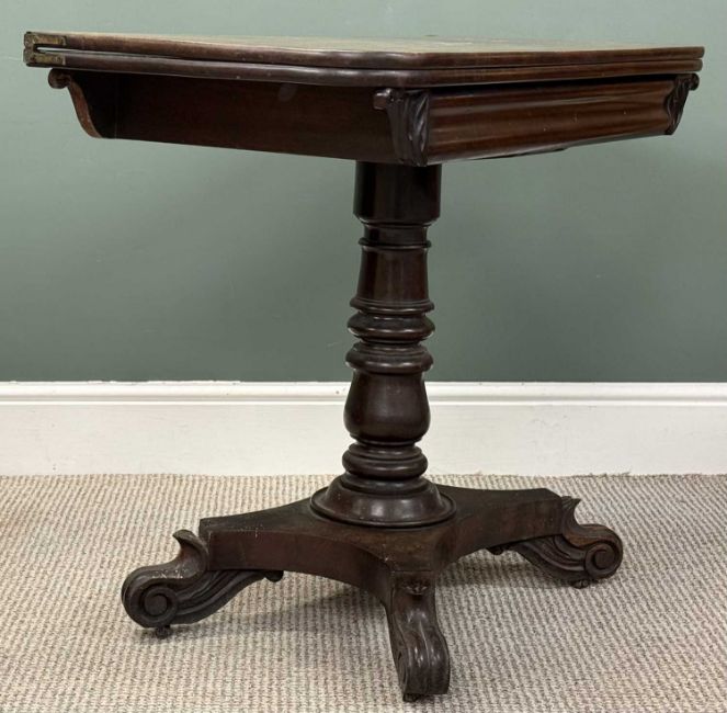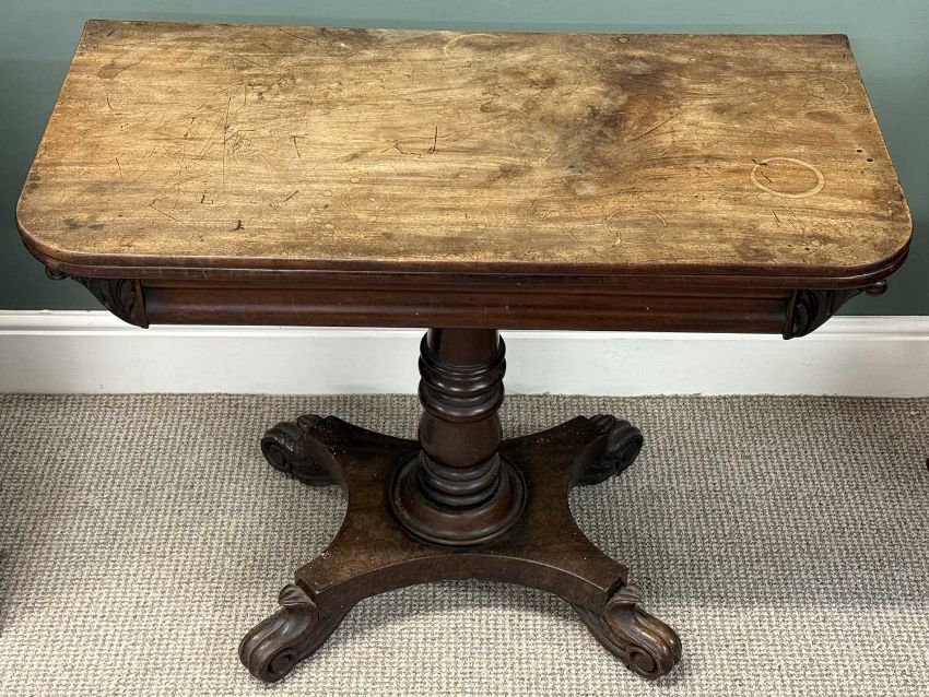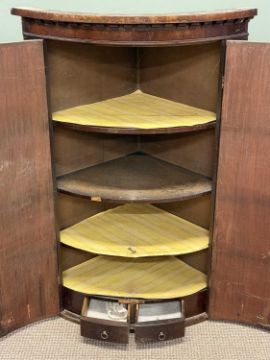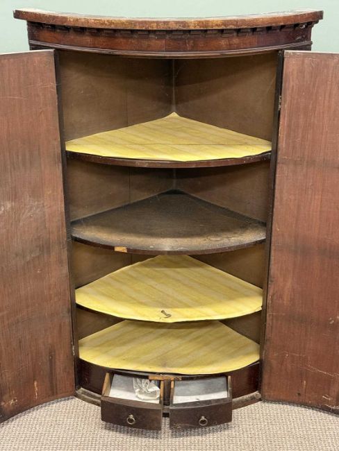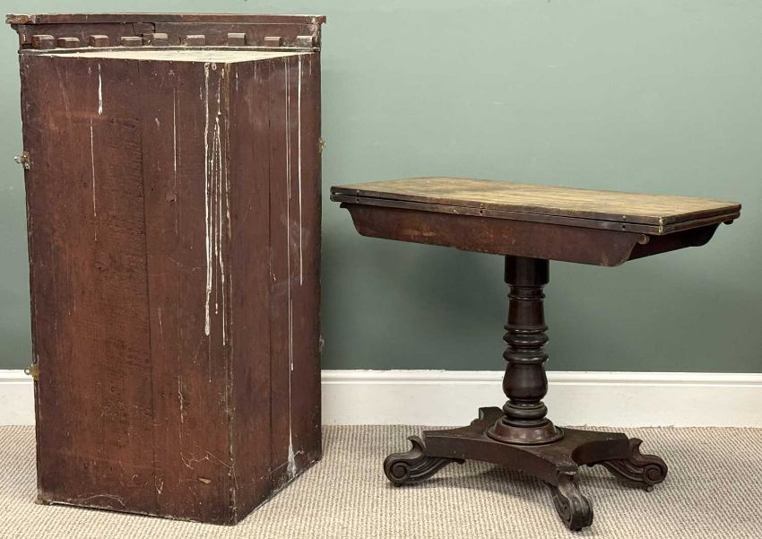 19TH CENTURY MAHOGANY TEA TABLE, fold-over top with polished interior, turned column to the quatrefoil base, 73 (h) x 92 (w) x 46cms (d); together with bow front two-door corner cupboard with shelved interior, 116 (h) x 78 (w) x 55cms (d) (2)Provenance: private collection Conwy
