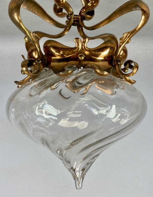 WAS BENSON OR STYLE ART NOUVEAU COPPER CEILING LIGHT FITTING of naturalistic form, with hand-blown glass shade, 40 (h) x 22cms (diam.)Provenance: private collection Ynys Môn