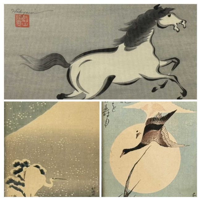 ‡ KATSUSHIKA HOKUSAI (Japanese, 1760-1849) pair of prints - geese flying in front of a full moon and egret with Mount Fuji, labels verso, 38 x 16cms; and WAKYOSAI (MOKUCHU URUSHARA) print - running horse, 24 x 34cms (3)Provenance: private collection Denbighshire