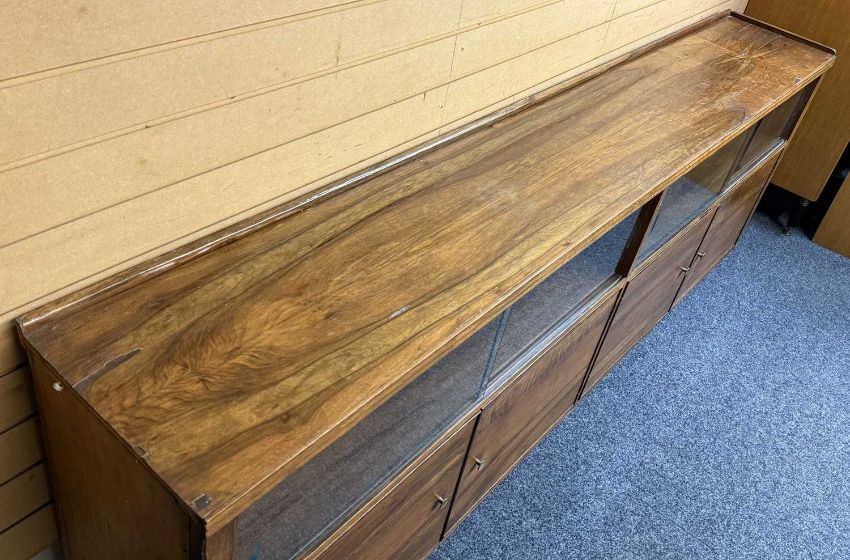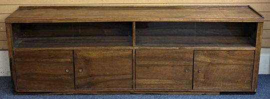 RETRO WALNUT LONG SIDEBOARD, four glass sliding doors over four door base unit, 85 (h) x 246 (w) x 39cms (d)Provenance: private collection Conwy