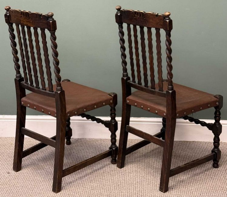 FURNITURE PARCEL, comprising pair of oak barley twist chairs, 100 (h) x 46 (w) x 42cms (d); and two Victorian circular footstools with tapestry seats, 10 (h) x 28cms (diam.)