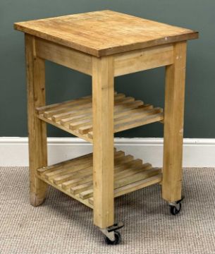 LIGHT WOOD KITCHEN WORK TROLLEY, with rectangular top and two slatted under tiers, on locking castors, 85 (h) x 60 (w) x 51cms (d)Provenance: private collection Cheshire