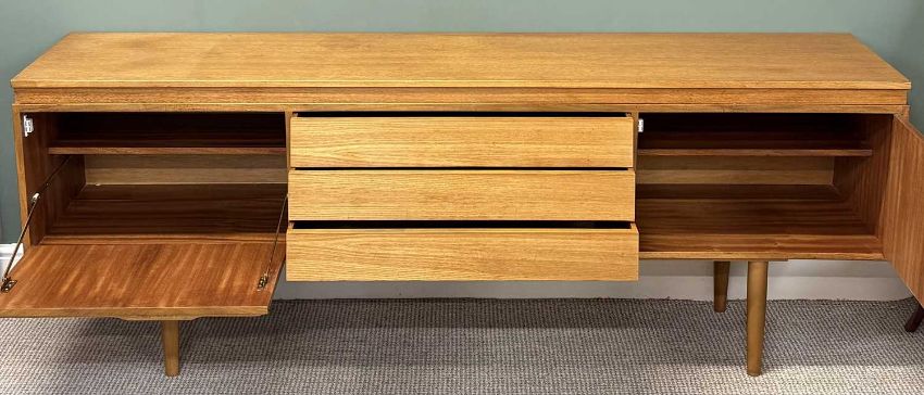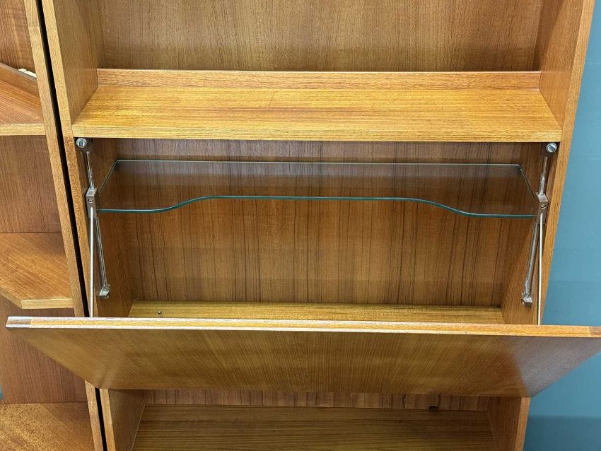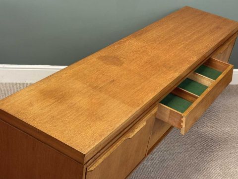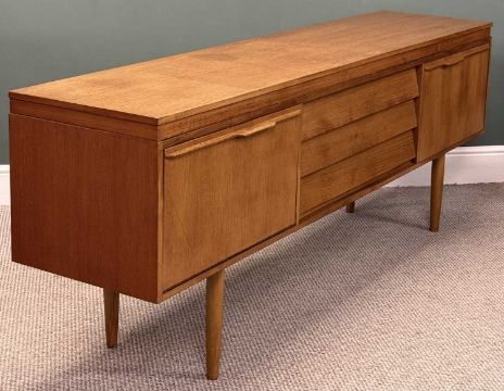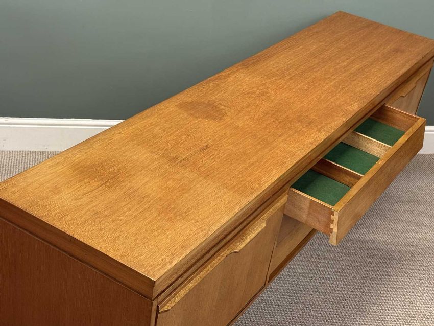 MID-CENTURY TEAK 'LONG JOHN' SIDEBOARD, three central drawers with cupboards to either side; and teak corner unit, raised back with shelves and bureau sectionProvenance: private collection Conwy