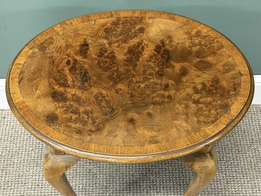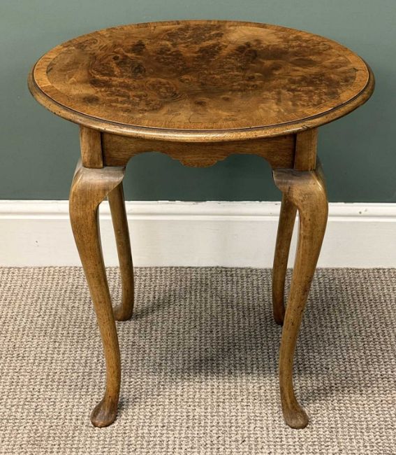 SMALL WALNUT OCCASIONAL TABLE, oval top with moulded rim, cabriole supports, 62 (h) x 53 (w) x 40cms (d)Provenance: private collection Conwy
