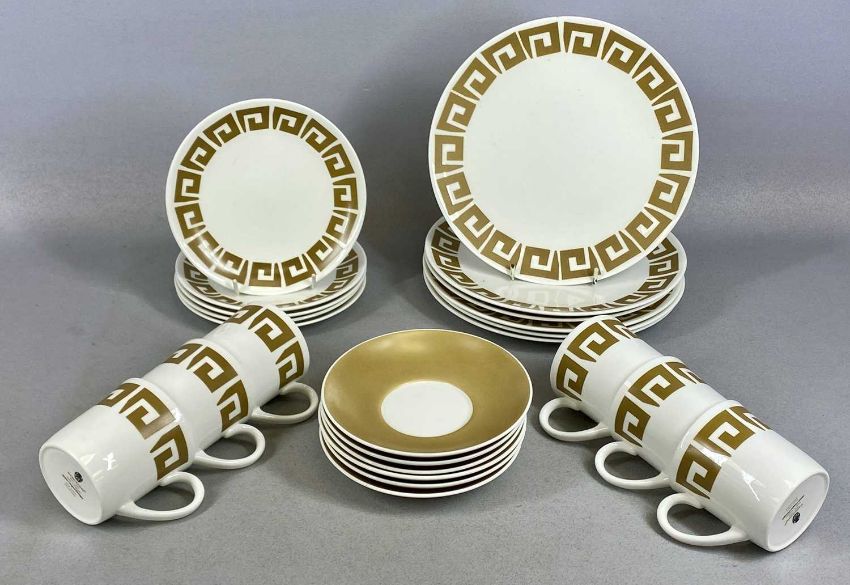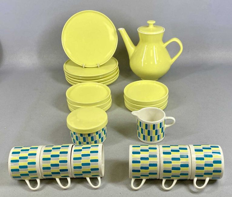RETRO TEAWARE, including Wedgwood Susie Cooper design 'Old Gold Keystone' set, 23 pieces; Melitta German set, yellow glazed and geometric pattern, 21 pieces; and six Pontesa Spanish Chinamoda floral side platesProvenance: deceased estate Conwy