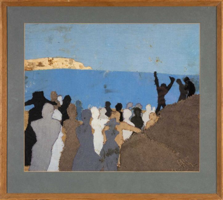 ‡ BIM GIARDELLI (1911-2009) fabric collage - entitled verso 'Welcome to St David', signature to fabric, 41 x 48cmsProvenance: private collection PowysComments: small tears, fabric wear and discoloration, framed, glazed